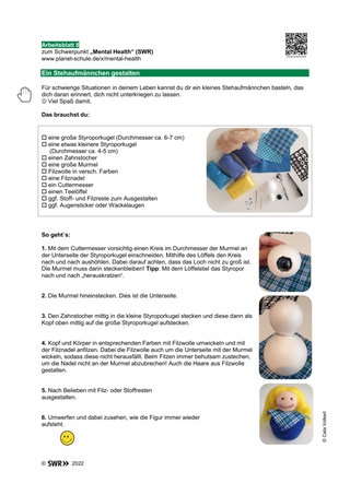 Gestaltung eines Stehaufmännchens als „Talisman“, der die Schüler:innen daran erinnert, sich auch in Krisensituationen nicht unterkriegen zu lassen und immer einmal mehr aufzustehen, als man hingefallen ist. (Arbeitsblatt 8)