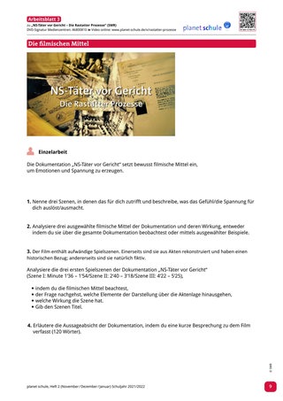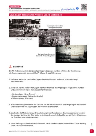 Die Dokumentation eignet sich sowohl für den Einsatz in der Klassenstufe 9 als auch in der gymnasialen Oberstufe. Die NS-Verbrechen, ebenso wie die Entnazifizierung, sind jeweils Bestandteile der Lehrpläne. Exemplarisch geht es in dem Film um die Prozesse gegen die Täter in den NS-Lagern Neue Bremm, Natzweiler-Struthof und Schirmeck, die jeweils unterschiedliche Aspekte des NS-Terrors ausmachten (Arbeitsblatt 1).