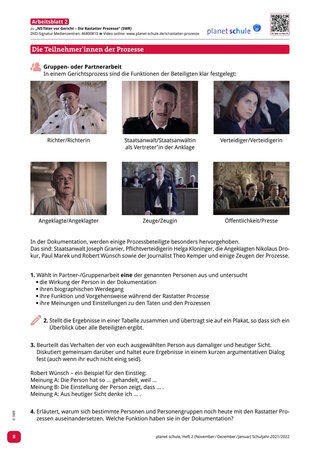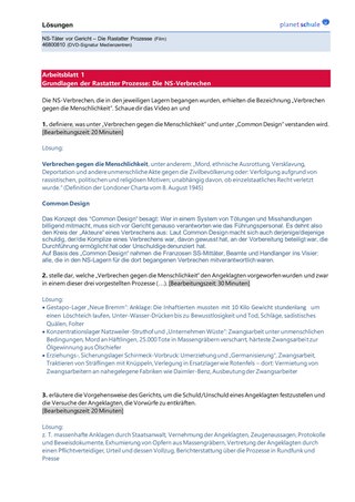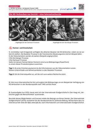 Recherchen zu weiteren Prozessen gegen NS-Täter (Nürnberger und Dachauer Prozesse) können die Sach- und Beurteilungskompetenz deutlich erweitern. Der Gegenwartsbezug lässt sich mit einer Recherche zu den letzten Prozessen gegen NS-Täter herstellen. Daran schließt sich eine Diskussion über den Umgang mit „Verbrechen gegen die Menschlichkeit“ an, die es auch heute noch gibt. Thematisiert wird auch die Arbeit des Internationalen Strafgerichtshofs in Den Haag. (Arbeitsblatt 5).