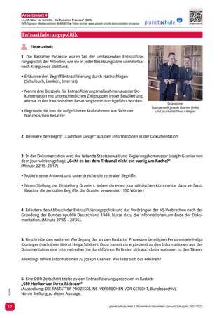 Ein weiterer Unterrichtsschwerpunkt wäre es, die Rastatter Prozesse unter dem Aspekt der Entnazifizierungspolitik der Besatzungsmächte (und zwar speziell Frankreichs) zu beleuchten: Ging es um Aufklärung, um die Wiederherstellung der Zivilisation? Nahmen die Besatzer Revanche? (Arbeitsblatt 4).