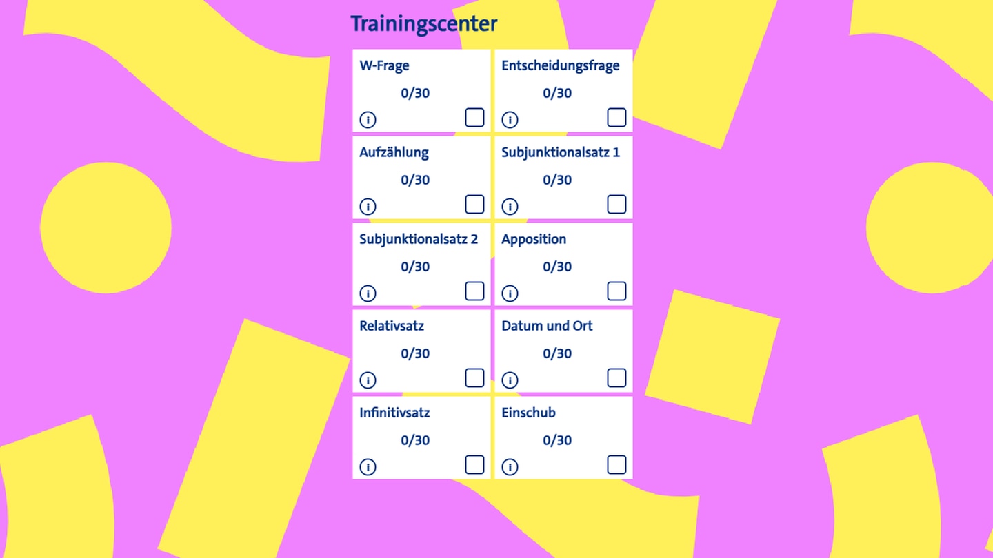 Möchtest du erst üben? Kein Problem! Im Trainingscenter kannst du gezielt Satzarten auswählen und trainieren. Du kannst eine Satzart alleine oder mehrere gleichzeitig üben. Für jede Kommaregel bekommst du 30 Beispielsätze. Deine Auswahl kannst du auch mit deiner Lehrkraft teilen.