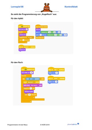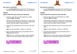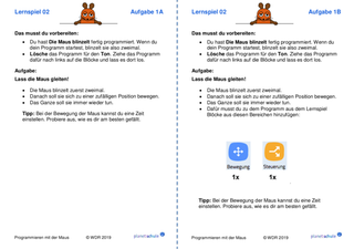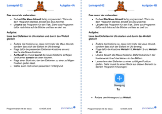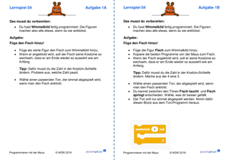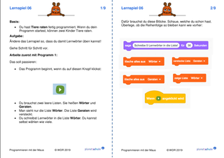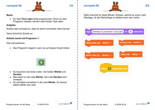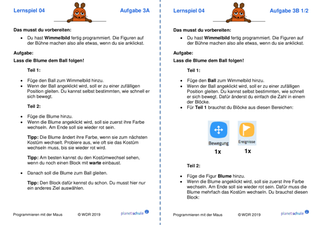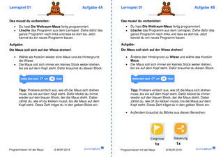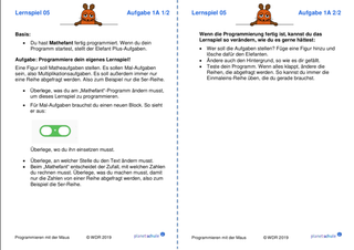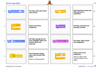 Danach arbeiten die Kinder jeweils mit einem Lernspiel aus "Programmieren mit der Maus". Schritt für Schritt lernen sie grundlegende Programmier-Konzepte wie Variablen, Schleifen und Verzweigungen kennen. Im Anschluss an jedes Lernspiel erhalten die Kinder Aufgabenkarten, die zu dem Lernspiel passen. Die Kinder wenden jeweils die neu erworbenen Fähigkeiten praktisch an und festigen sie dadurch. Mit einem Karten-Lege-Spiel können die Kinder die Befehle, die sie in den Lernspielen kennengelernt haben, noch einmal sichern oder sie am nächsten Unterrichtstag wiederholen.