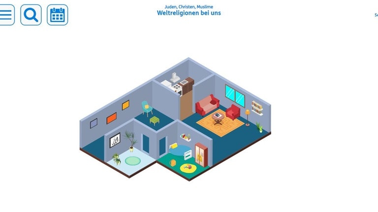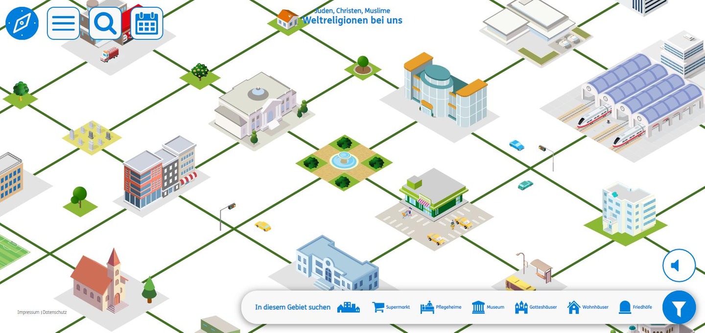 Beim Anklicken der Gotteshäuser und Wohnhäuser erscheint eine Innenansicht mit mehreren Räumen, in denen man über eine klassische Navigation Informationstexte zu den betreffenden Religionen findet. Auch hinter den Pflegeheimen und Friedhöfen verbergen sich Informationen. An diesen Orten suchen die Schüler*innen nach Antworten auf die ihnen gestellten Fragen.