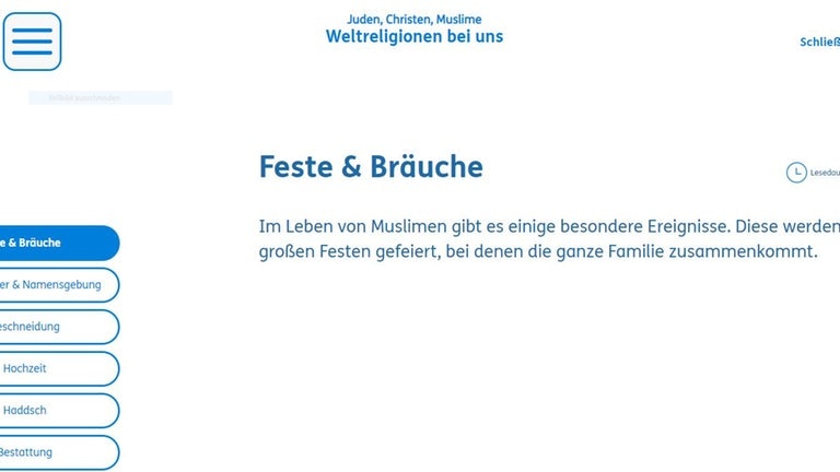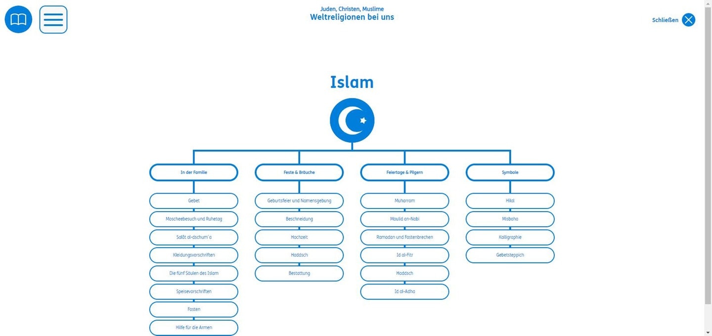 Eine Übersicht über den Gesamtcontent lässt sich über das Symbol der Religion auswählen. Alle Inhalte sind auch über Quicklinks direkt ansteuerbar.