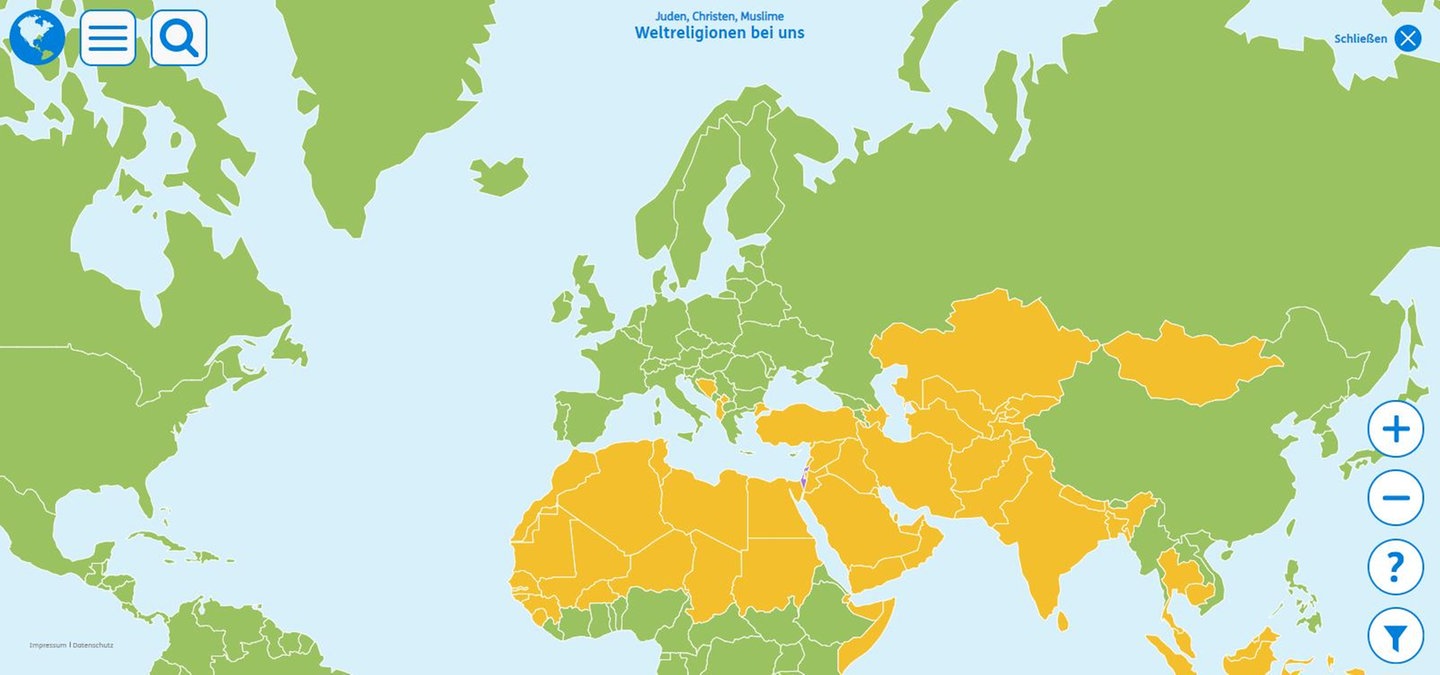 Auf einer Weltkarte kann erkundet werden, in welchem Land die Religionen prozentual wie verteilt sind.