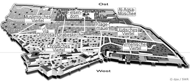 - 1. Warum ist Jerusalem für die verschiedenen Religionen so wichtig? Informationen dazu findest du in dem Kapitel "Vielvölkerstaat Palästina" (s. [Dieser Link öffnet ein neues Browser-Fenster]Hintergründe – Vielvölkerstaat Palästina). Die Stadt Jerusalem ist zentral für den Glauben von drei Religionen. Die Muslime sehen - am Ende der Tage - hier den Eingang zum Paradies. Im antiken jüdischen Staat war Jerusalem die Hauptstadt. Hier befindet sich auch ein - zerstörter - jüdischer Tempel. Im Christentum gilt Jerusalem als Ort der Kreuzigung und Auferstehung von Jesus Christus.