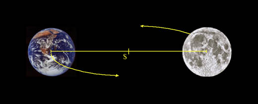 Wenn Mond und Erde die gleiche Größe hätten, würde sie beide um einen Punkt, der genau auf halber Strecke zwischen ihnen liegt, kreisen. |