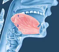 der Zunge, 2. Zungengrund, 3. Kehldeckel, 4.