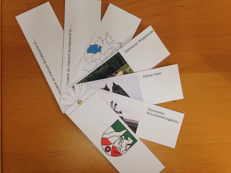 Um die Informationen aus der jeweiligen "2 durch Deutschland"-Folge zu vertiefen, basteln die Schüler in Einzelarbeit ein Fächerbuch. Es stellt eine Art Steckbrief ihres jeweiligen Bundeslandes dar. Auf den einzelnen Seiten des Fächerbuchs können die Schüler das Landeswappen ausmalen, ihr Bundesland auf einer Deutschlandkarte markieren, ihre Landeshauptstadt eintragen, Sehenswürdigkeiten zuordnen und eigene Vorlieben bezüglich des Bundeslandes nennen.