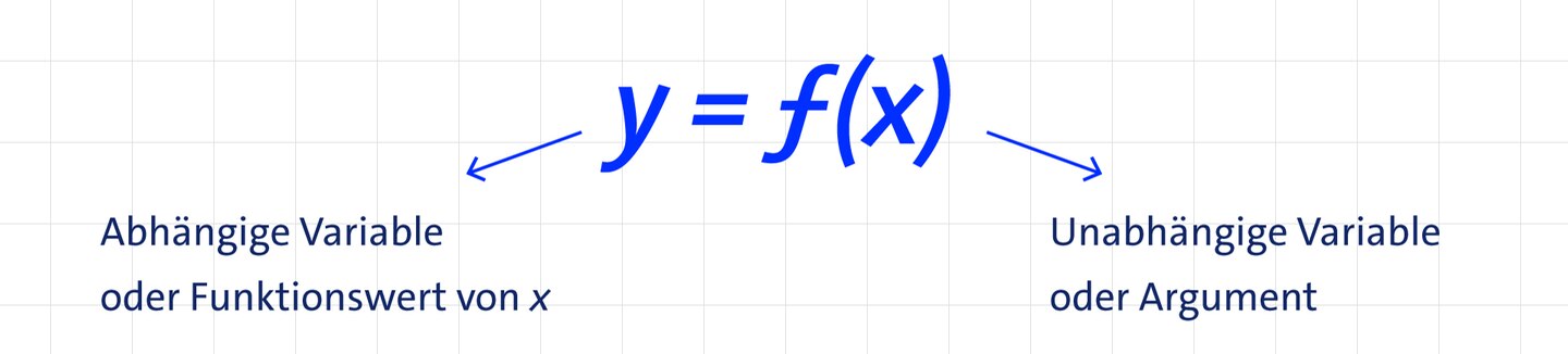 Funktionen werden mit Kleinbuchstaben f, g, h, usw. bezeichnet. Dargestellt werden kann die Funktion als Zuordnungsvorschrift f: x ↦ y (Sprechweise: „Funktion f, jedem x wird zugeordnet ein y“, oder „x wird abgebildet auf y“) oder als Funktionsgleichung f: y = f(x) (Sprechweise: „Funktion f, der Funktionswert an der Stelle x ist der y-Wert“). Die Variable x wird als unabhängige Variable bezeichnet (x kann frei aus der Definitionsmenge D gewählt werden), y wird als die von x abhängige Variable bezeichnet.