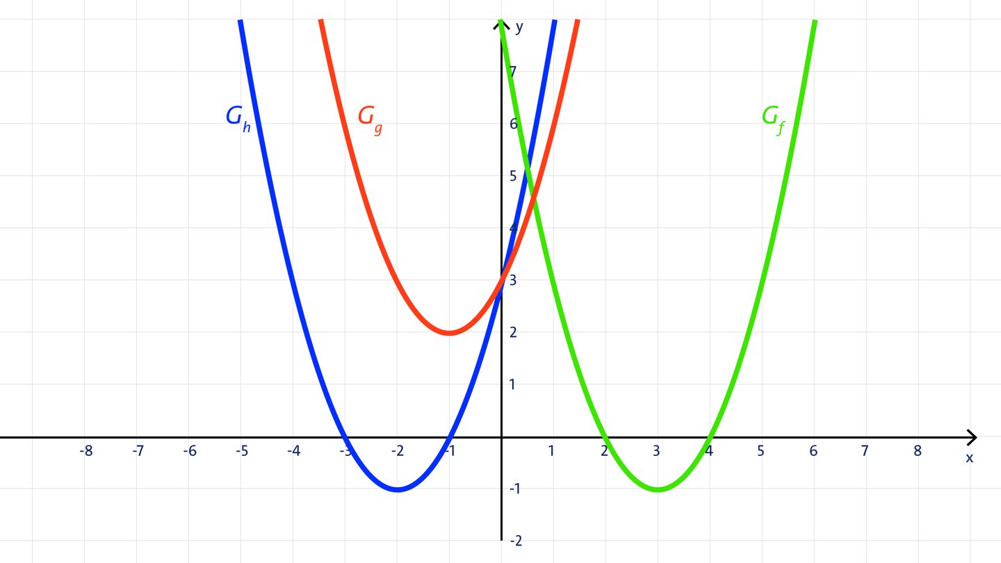 Bestimme anhand der Graphen der Funktionen f, g und h die Koordinaten des Scheitelpunkts und die Funktionsgleichung der Parabeln.