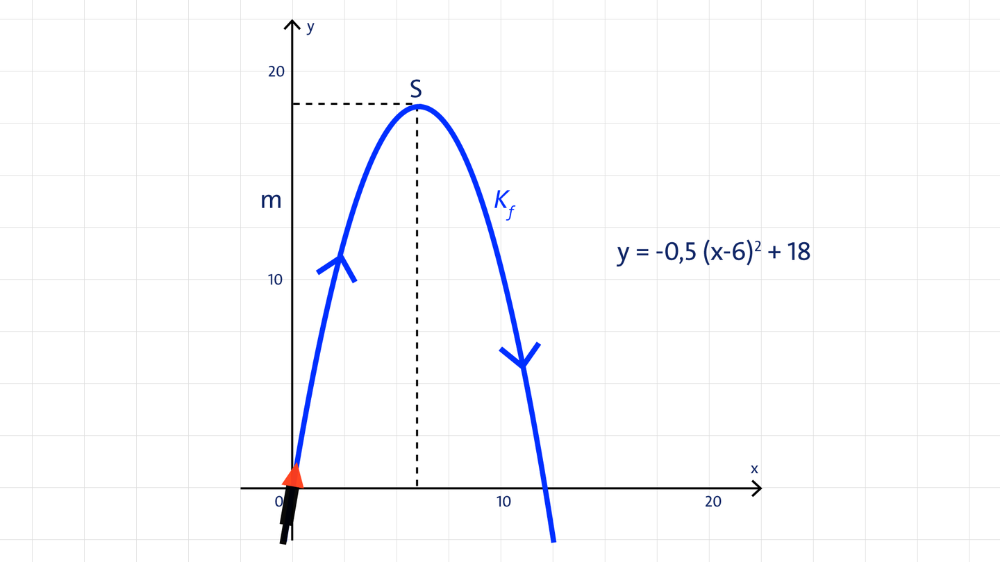 Du zündest eine Feuerwerksrakete am Boden. Die Flugbahn der Rakete lässt sich durch eine Parabel mit der Funktionsgleichung y = -0,5 (x - 6)² + 18 beschreiben, wobei x die Entfernung vom Startort in Metern und y dieFlughöhe in Metern angibt. Bestimme, in welcher Entfernung x vom Startort die Rakete nach dem Flug wieder auf dem Boden landet.