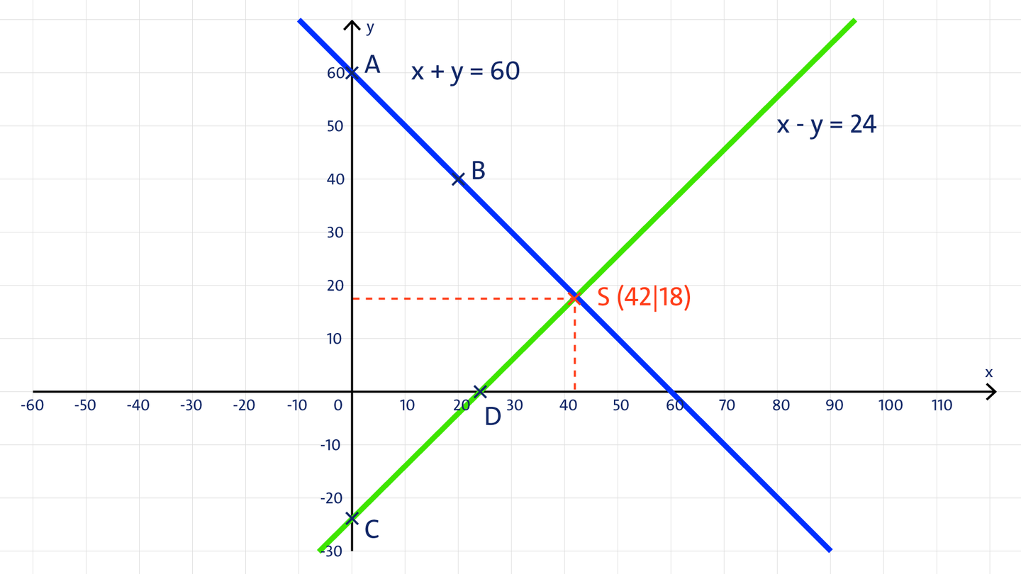 Zur Lösung der Aufgabe kann folgendes lineare Gleichungssystem verwendet werden: (I) x + y = 60 (II) x - y = 24