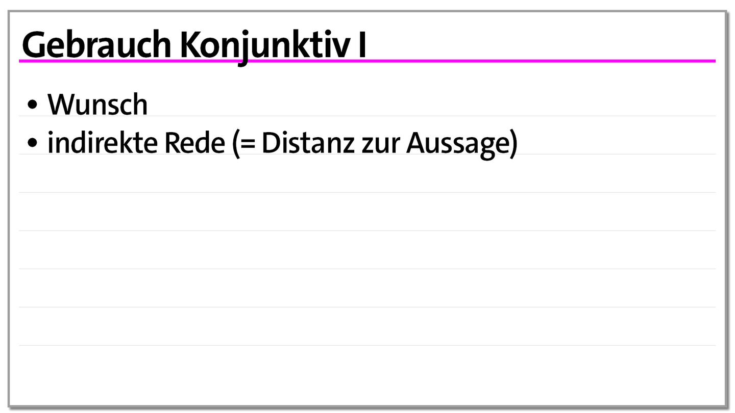 Der Konjunktiv I ist besonders wichtig, wenn es darum geht, Redebeiträge in einer Inhaltsangabe oder beim Auswerten von Material wiederzugeben. Er sollte nicht zur bloßen Nacherzählung verwendet werden, sondern als Mittel um wörtliche Rede wiederzugeben. Ein Beispiel hierfür wäre, dass eine Expertenmeinungen in einem wissenschaftlichen Text zitiert wird.