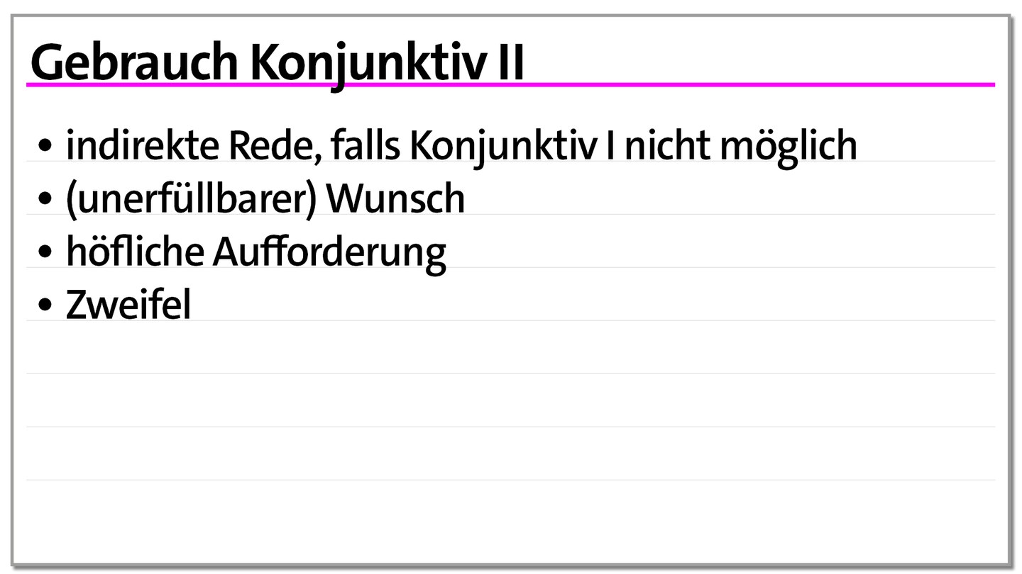 Der Konjunktiv stellt eine Möglichkeitsform des Verbs dar - anders als der Indikativ, der die Wirklichkeit beschreibt, und der Imperativ, der eine Aufforderung ausdrückt. Der Konjunktiv wird verwendet, um eine Aussage als Möglichkeit oder Wunsch auszudrücken.