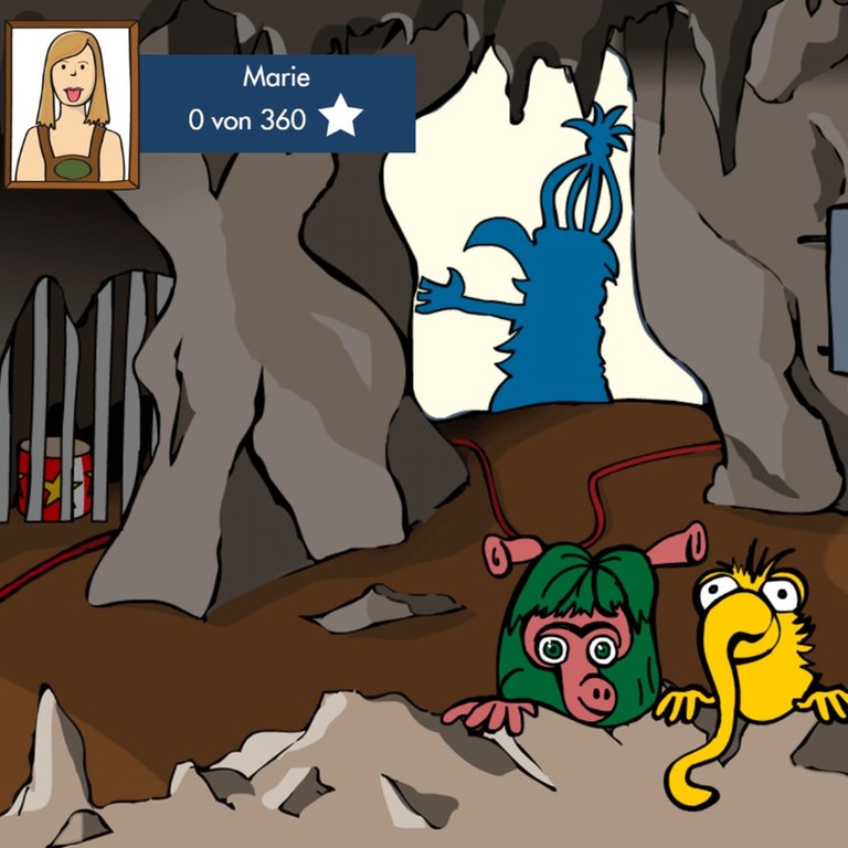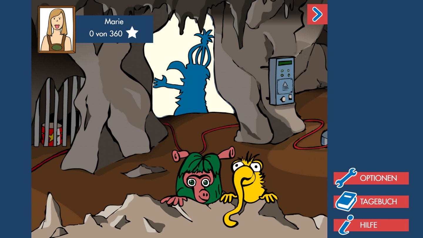 Mit der Pfeiltaste kommt der Spieler jederzeit zurück in die Höhle von Mumbro und Zinell. Ein Lerntagebuch informiert über den eigenen Lernfortschritt