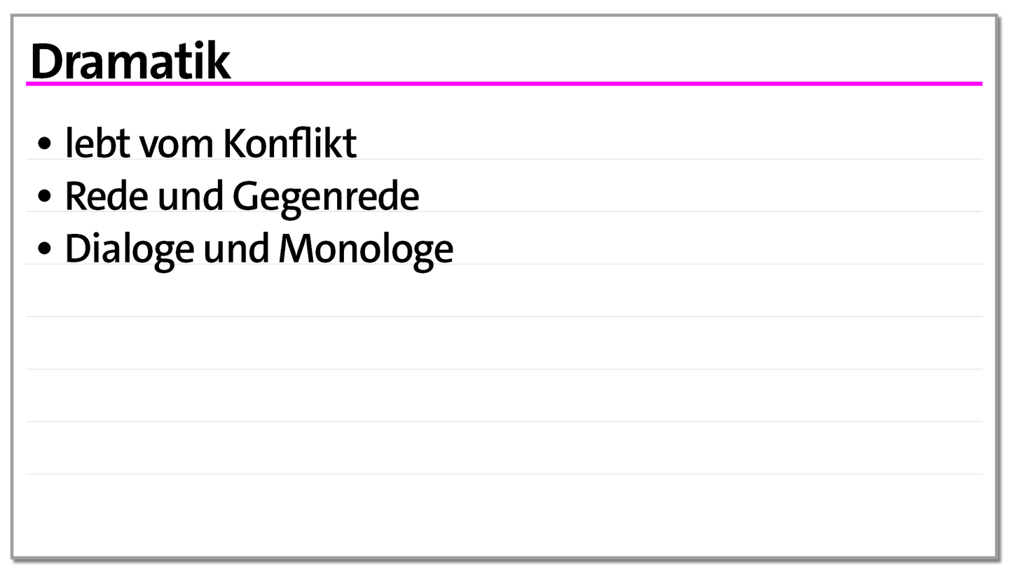 Die Dramatik lebt vom Konflikt und wird durch Rede und Gegenrede organisiert, die das Geschehen vorantreiben. Ein Erzähler ist hier in der Regel nicht vorhanden. Dramatik realisiert sich erst auf der Bühne und ist häufig - vor allem im traditionellen Drama – in Akte und Szenen gegliedert. Monologe und Dialoge sind zentrale Elemente, und Regieanweisungen geben den Schauspielern zusätzliche Anweisungen. Zu den dramatischen Gattungen zählen Komödie, Tragödie und Tragikomödie.