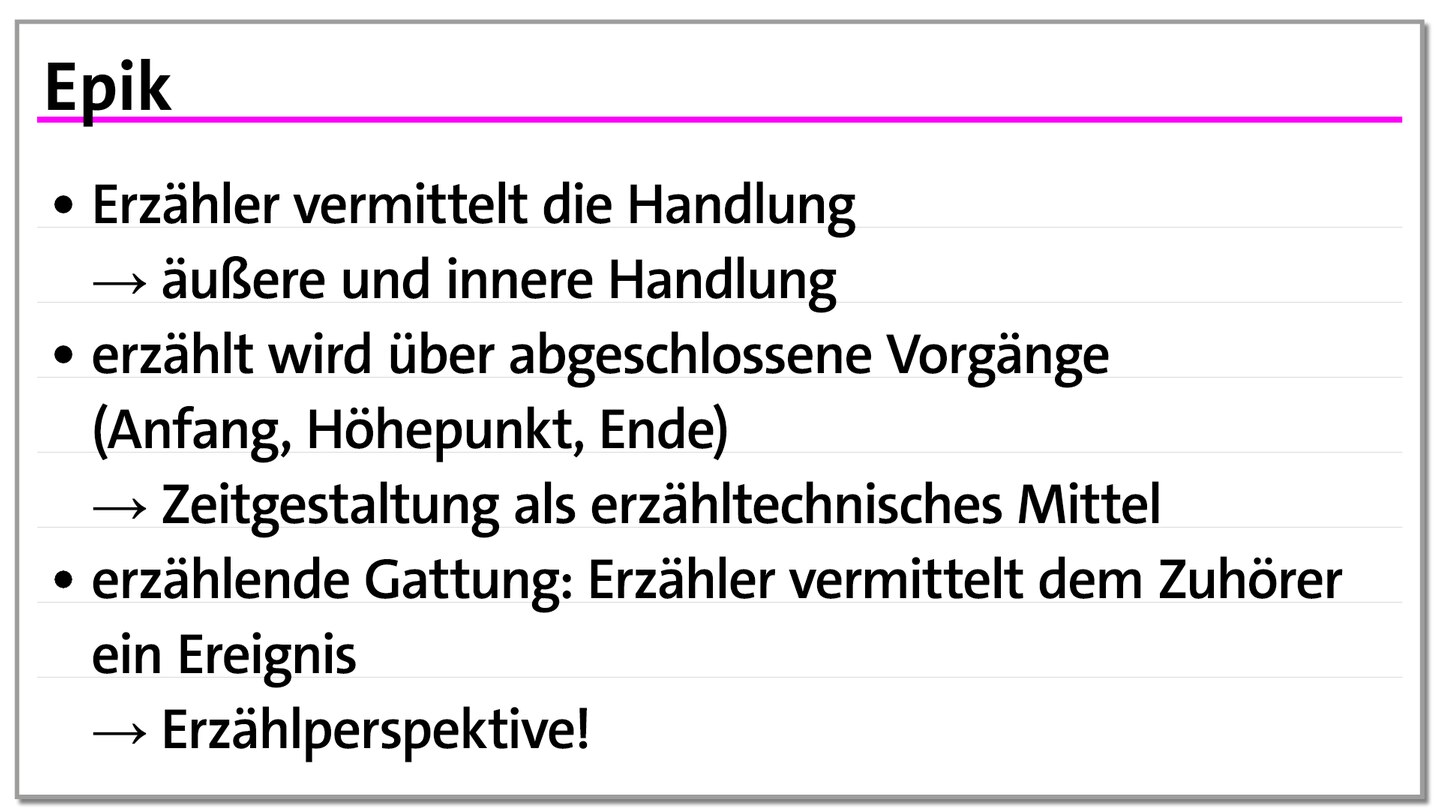 Die Epik ist die erzählende Gattung und lebt von der Handlung. Sie vermittelt abgeschlossene Vorgänge durch einen Erzähler, der zwischen Ereignis und Zuhörer vermittelt. Verschiedene Erzähltechniken kommen zum Einsatz, darunter auktoriale, personale und neutrale Perspektiven sowie der Ich-Erzähler. Die Darbietungsformen umfassen Erzählberichte und verschiedene Formen der Figurenrede. Zeitgestaltung spielt eine wichtige Rolle, wobei zwischen Zeitdeckung, Zeitdehnung und Zeitraffung unterschieden wird. Epische Gattungen sind unter anderem Roman, Novelle und Kurzgeschichte.