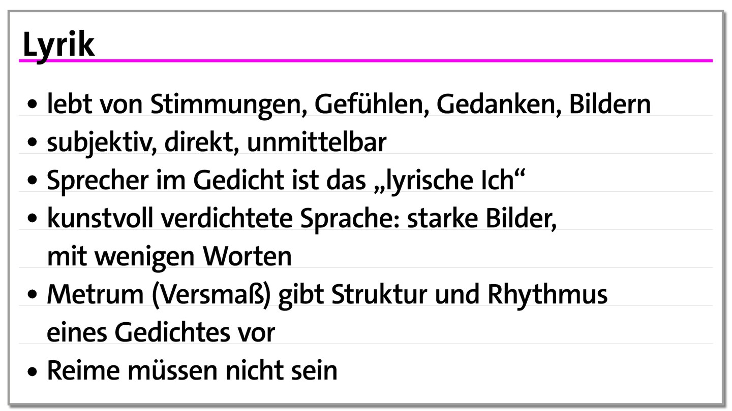 Die Lyrik ist die subjektivste der drei Gattungen und lebt von Stimmungen, Gefühlen und Gedanken. Sie zeichnet sich durch eine kunstvoll verdichtete Sprache aus, die Rhythmus, metrische Bindung und Reim umfassen kann. Der Sprecher im Gedicht ist das sogenannte lyrische Ich. Zu den lyrischen Gattungen gehören unter anderem Liedtexte, Oden, Elegien und Sonette.
