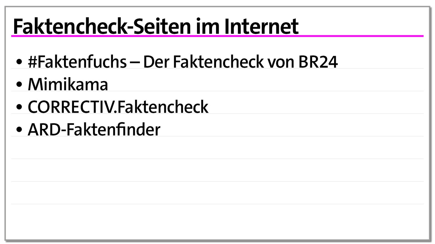 Wenn du bei einer Nachricht misstrauisch bist, kannst du auf Faktencheck-Seiten im Internet recherchieren, ob die entsprechende Nachricht bereits geprüft wurde. Seiten wie der ARD-Faktencheck (tagesschau.de/faktenfinder), der BR-Faktenfuchs (br.de/nachrichten/faktenfuchs-faktencheck) oder Mimikama (mimikama.org) helfen dir, Fake News zu erkennen und bieten Gegendarstellungen zu falschen Informationen.