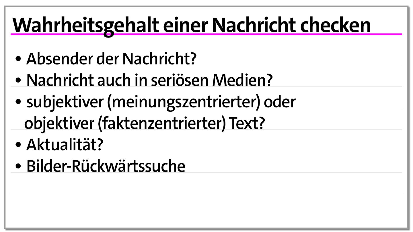 Nicht alles, was im Internet steht, ist wahr. Überprüfe, ob die Informationen von mehreren seriösen Medien bestätigt werden. Ist der Text objektiv oder subjektiv geschrieben? Seriöse Texte sind faktenbasiert.