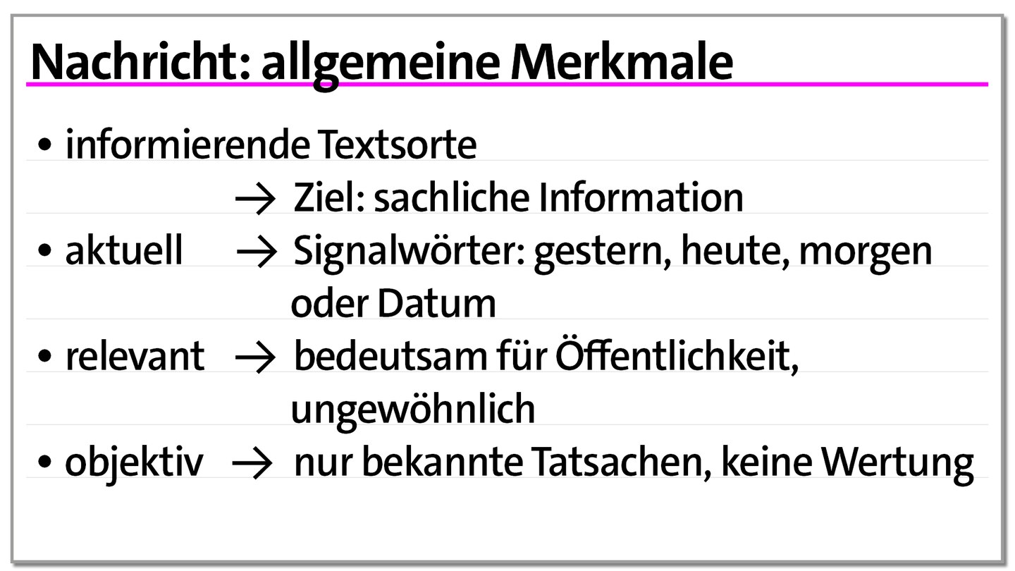 Eine Nachricht ist eine informierende Textsorte, deren Ziel es ist, sachliche Informationen zu vermitteln. Sie berichtet über aktuelle Ereignisse, die durch Signalwörter wie „gestern“, „heute Morgen“ oder ein konkretes Datum erkennbar sind. Diese Aktualität ist ein wesentliches Merkmal einer Nachricht.