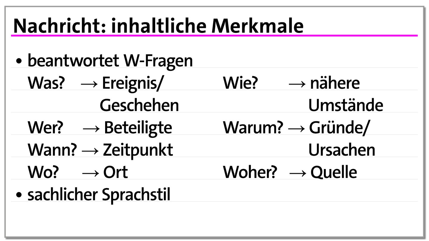 Eine Nachricht wird möglichst objektiv verfasst. Das heißt, sie gibt nur die bekannten Tatsachen wieder, ohne subjektive Wertung. Das heißt, es wird nicht bewertet, ob das Geschehen gut oder schlecht ist.