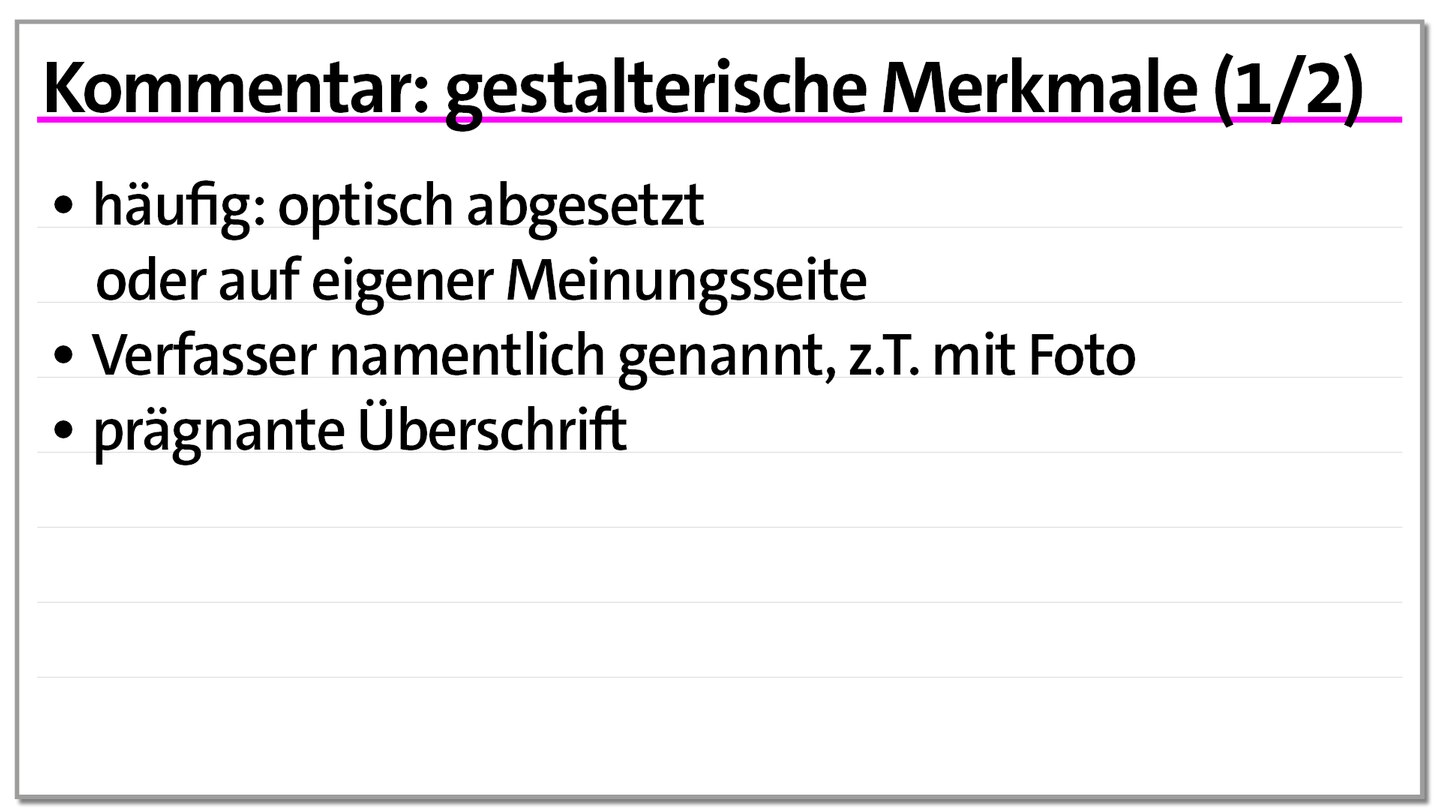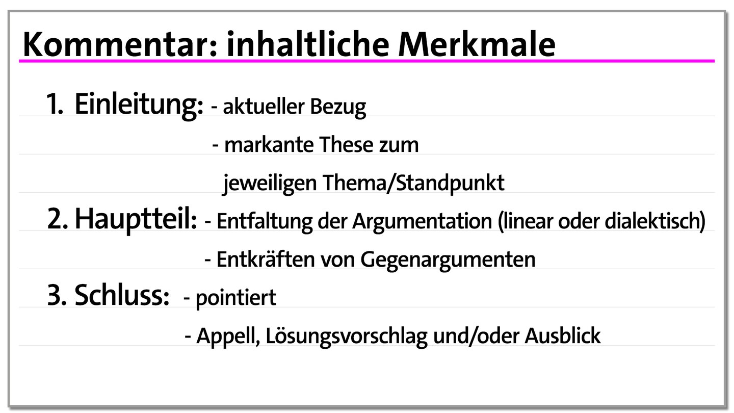 Eine deutliche Position zu einem aktuellen Thema, eine klare Struktur, starke Argumente und der richtige Einsatz sprachlicher Mittel sind das Wichtigste beim Schreiben eines Kommentars. Wenn du kritisch verschiedene Quellen auswertest, deine Position gut begründest und Gegenargumente geschickt entkräftest, kannst du deine Meinung überzeugend darstellen – und zugleich den Leser zum Nachdenken anregen.