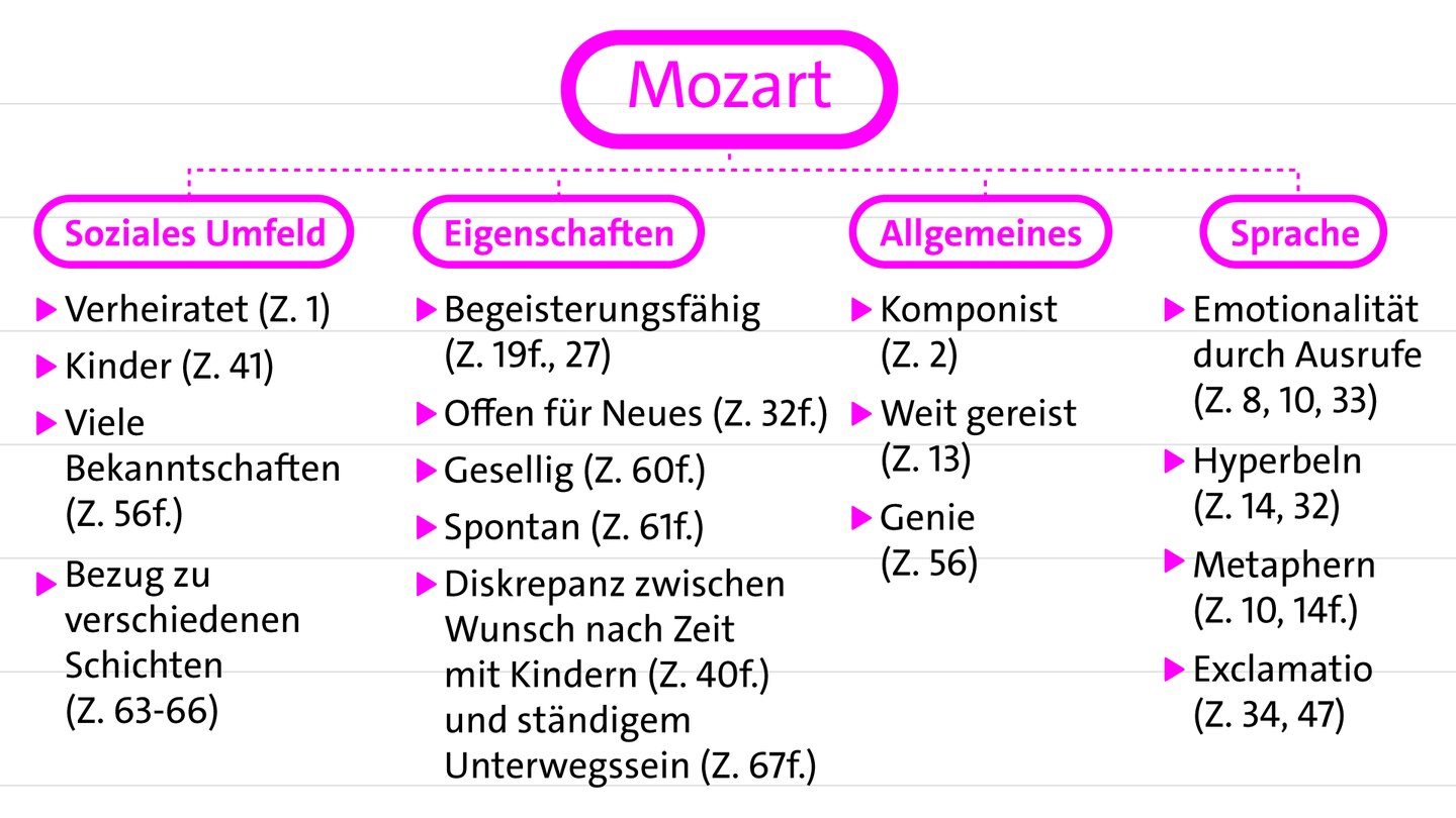 Erstelle zu folgendem Text eine Stoffsammlung. Wähle dabei aus den drei Arten (Stichpunktliste, Tabelle, Cluster) die für dich geeignete Form aus. Die Aufgabenstellung dazu lautet: „Charakterisiere die Figur Mozart“.