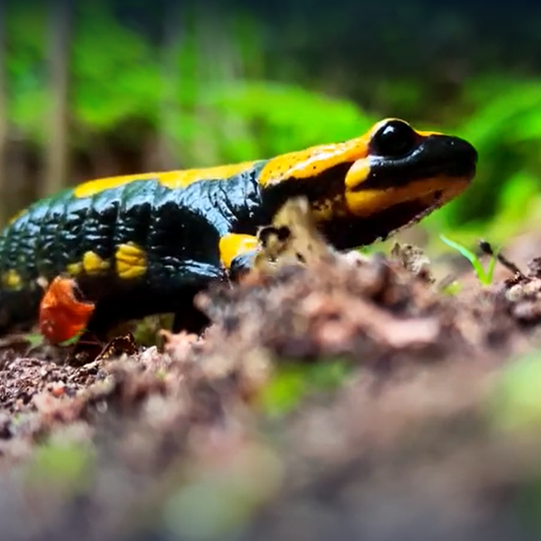 Der schwarz-gelb gefleckte Feuersalamander – er war 2016 Lurch des Jahres in Deutschland - zählt zu den Amphibien; seine ersten Lebensmonate verbringt er im Wasser, ehe er nach einer Metamorphose an Land geht, wo er seinen idealen Lebensraum in feuchten Mischwäldern findet. Er ist in Europa weit verbreitet.