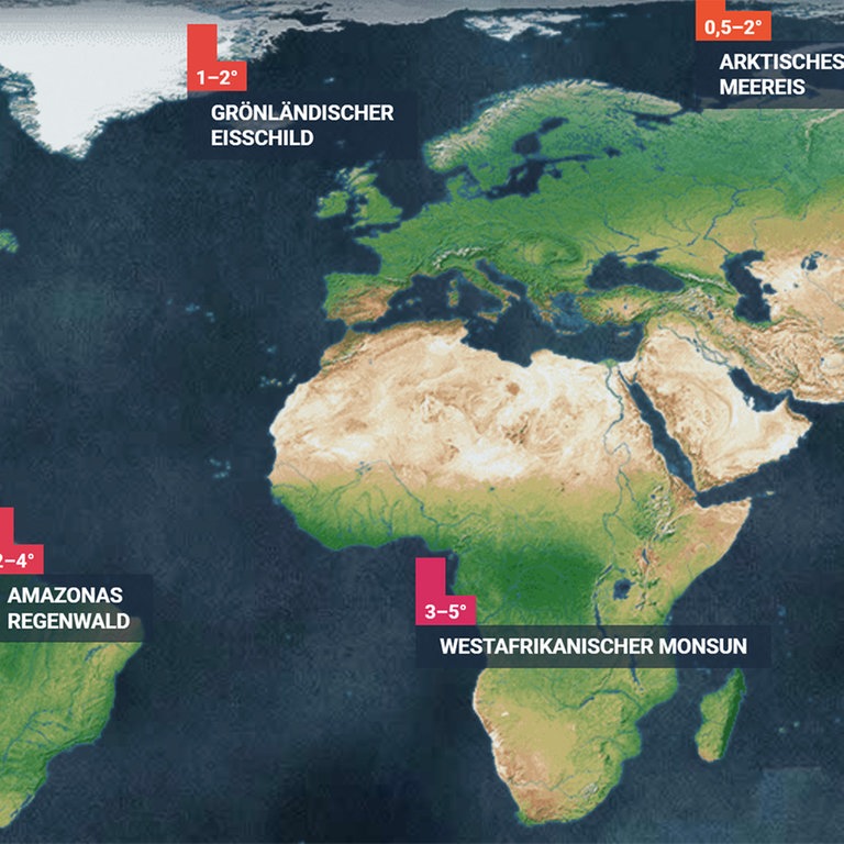 Überschwemmungen, extreme Dürre oder Wirbelstürme: Was passiert, wenn die Erde zwei Grad wärmer wird? Was passiert, wenn es fünf sind? Die interaktive Simulation "Kippelemente" erklärt auf einfache Weise, welche Folgen der Klimawandel für verschiedene Regionen auf der Erde hat:
