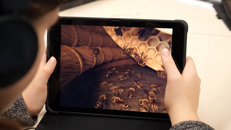 Die Oculus-Quest-Brille aufgesetzt und schon geht’s mitten hinein in die Welt der Bienen! Die digitale Technologie der Virtual Reality (VR) bietet einen 360° Rundumblick und verschiedene Spielmöglichkeiten, um den Bienenstock und sein Innenleben mit ungewohntem Blickwinkel zu erkunden: