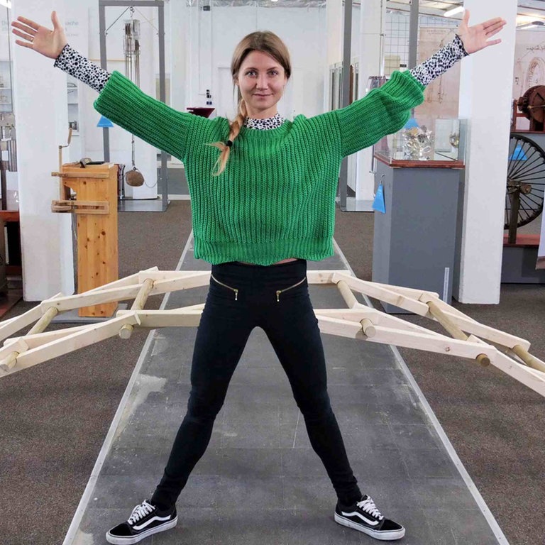 In Bielefeld schaut sie sich einige von Leonardos Erfindungen an, die Studenten anhand von alten Skizzen nachgebaut haben. Dabei erfährt sie auch etwas über seine geheimnisvolle Handschrift.