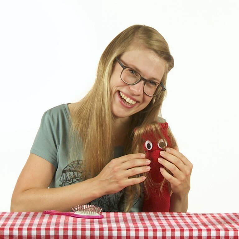 Esther kämmt sich die Haare. Socke will sich auch die Haare kämmen. Aber er hat ja keine. Zum Glück hat Ester eine gute Idee.